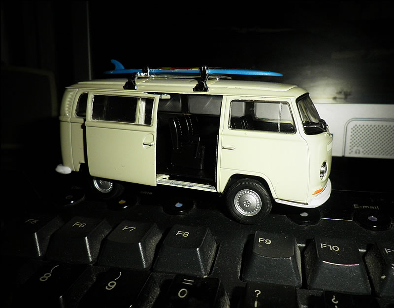 Las Volkswagen T2 no se encuentran muy a menudo en miniatura, y menos aún con baca y tablón en el techo, así que me ha gustado el detalle. Gracias chavala!!!