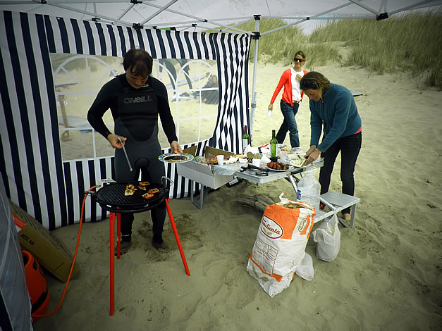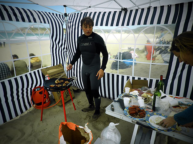 No es demasiado normal lo de hacerse una barbacoa en la playa. De hecho al principio estuve preocupado de que apareciera la autoridad competente a pegarnos el toque, pero por ahí no apareció ni el tato. Fue cosa de los amigos de El Pasillo, y a ellos se lo agradezco de todo corazón. Lo de disfrutar de un bocata de panceta con el traje puesto, en la arena, es un lujo que pocas veces se puede disfrutar.