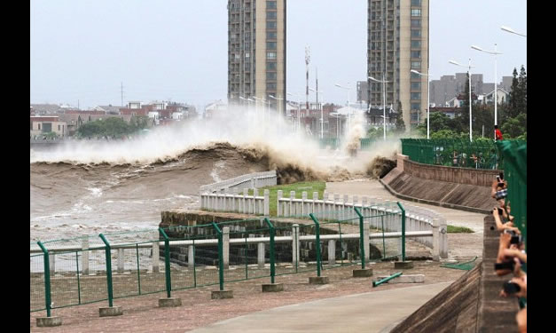 O al menos una ola de las que estamos acostumbrados a ver. Se trata de una ola de río, que ayer mismo causó heridos y daños importantes en la localidad china de Hainin. Se trata del río Qiantang, que es famoso por sus olas, y que se puso así debido al tifón Trami. En el vídeo lo podéis ver mucho mejor, impresionante!!