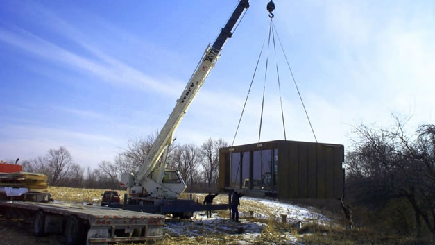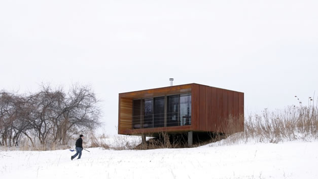 Esta casa se encuentra en las praderas de Minnesota y es obra de Alchemy Architects. Es prefabricada, se contruyó en una factoría y se montó así como la veis. Pequeña, sencilla, con unas formas rotundas. No se que tiene o que no tiene, pero me gusta.
