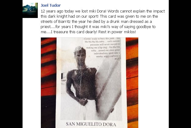Hoy hace doce años que murió Miki Dora. Tiene gracia que en una fecha como ésta, Joel Tudor en su Facebook se acuerde del encuentro en Biarritz con Didac Piquer, y de aquella estampita que le dió, y que todavía conserva…