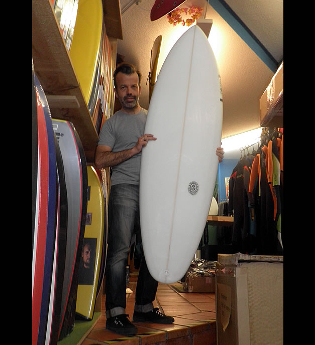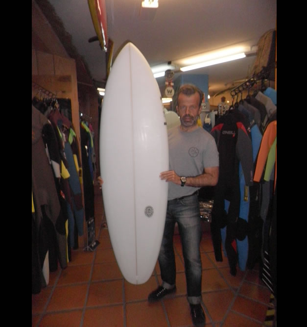 Es un 5’9″, pero bien rellenita, así que tiene que tener una buena remada. Unas quillas fijas de tamaño considerable y un estado general perfecto. Por si os interesa, son 430€ por una tabla muy complicada de conseguir.