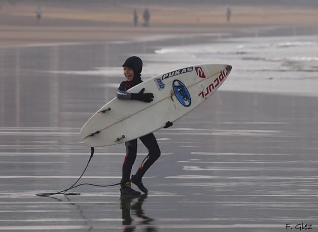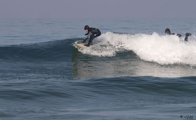 «Poco se de él, solo que hoy apareció enmedio de todo el mundo acompañado por su padre, y fue el foco de atención. Se pilló un montón de olas y se lo pasó como los indios. «¿Cuando vienen las olas?», le preguntaba al progenitor; evidentemente los crios no llevan bien eso de esperar, y mucho me temo que el quería que la cosa fuera constante. Yo también. Se llama Pelayo y es de Gijón, aunque ayer en Salinas disfrutó como lo que es, un enano de 7 años.