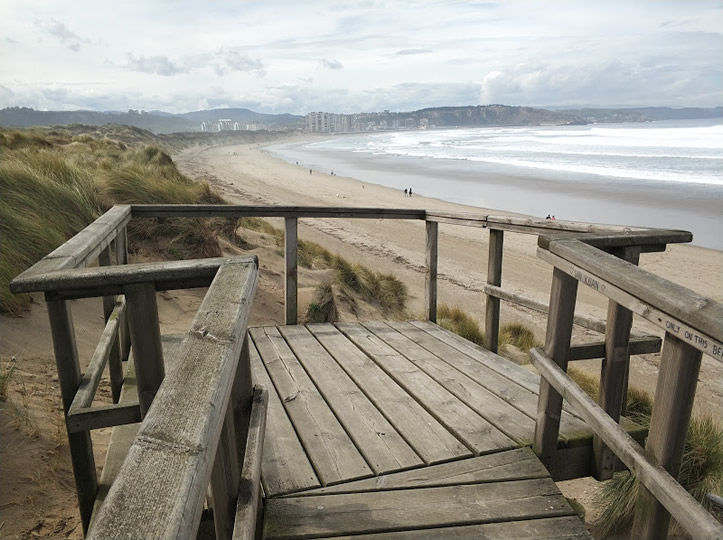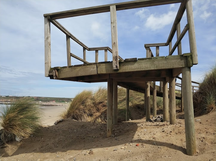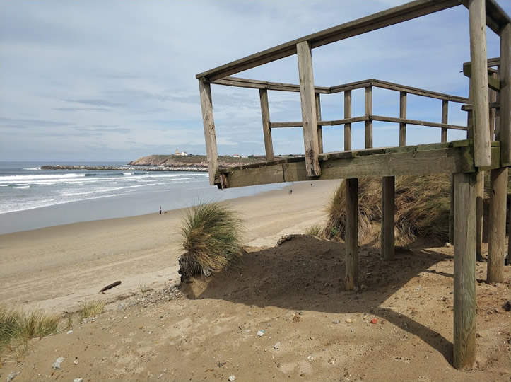 Igual suena un poco exagerado, pero el peligro es evidente y claro. El mirador de la playa de San Juan está cojo, literalmente. Ya en su momento lo cortaron por la mitad, pero es que ahora a esa mitad le falta un poste, un pie. Se mueve y está a punto de desmoronarse, con tablones y clavos oxidados por doquier.