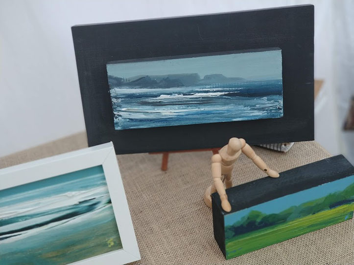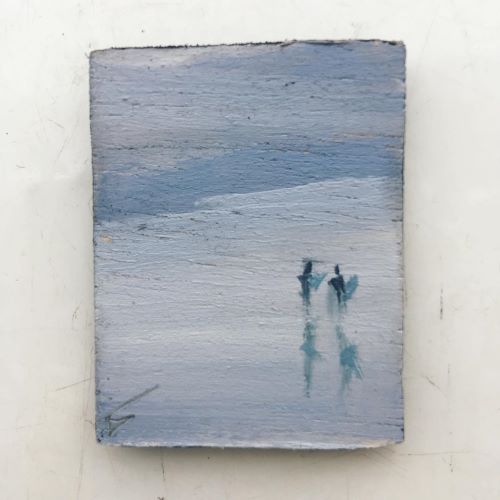 A veces la primera impresión es la que vale, y en este caso fue cierto. Conocí la obra de Itziar Sánchez Chicharro a través de la gente de Kalevala, pues trabajan juntos y son amigos. Me alucinaron las miniaturas, las pinturas en un formato muy muy pequeño. Me sorprendieron porque aún siendo muy pequeñas dicen mucho. Es muy difícil expresar con tan poco, y es que Itziar hace maravillas con cuatro trazos; un brochazo blanco y ves una espuma; un punto amarillo es una luz… Facil? en absoluto, muy muy difícil!!!